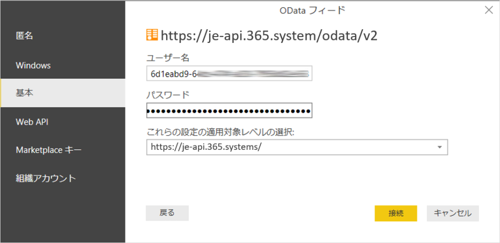 - ODataへのアクセス確認画面が表示されますので、[基本]タブのユーザー名とパスワードの双方にAPIキーを入力してください。